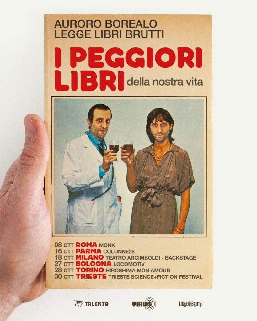 La serata al Monk di Roma è stata un piccolo rito collettivo. Auroro Borealo è salito sul palco con la sua solita aria tra il professore svagato e lo showman in missione culturale. Ha sventolato i libri come reliquie pop, li ha letti con enfasi drammatica, ha narrato le gesta dell’epico leghista Cazzaniga contro le “spie pivettiane”, ha estratto pagine a caso del “libro con più refusi al mondo” (“…E se Dio non esistesse”…) e le ha fatte leggere al pubblico fra un tripudio di orrori grammaticali, punteggiature naif e incisi che non portano da nessuna parte.